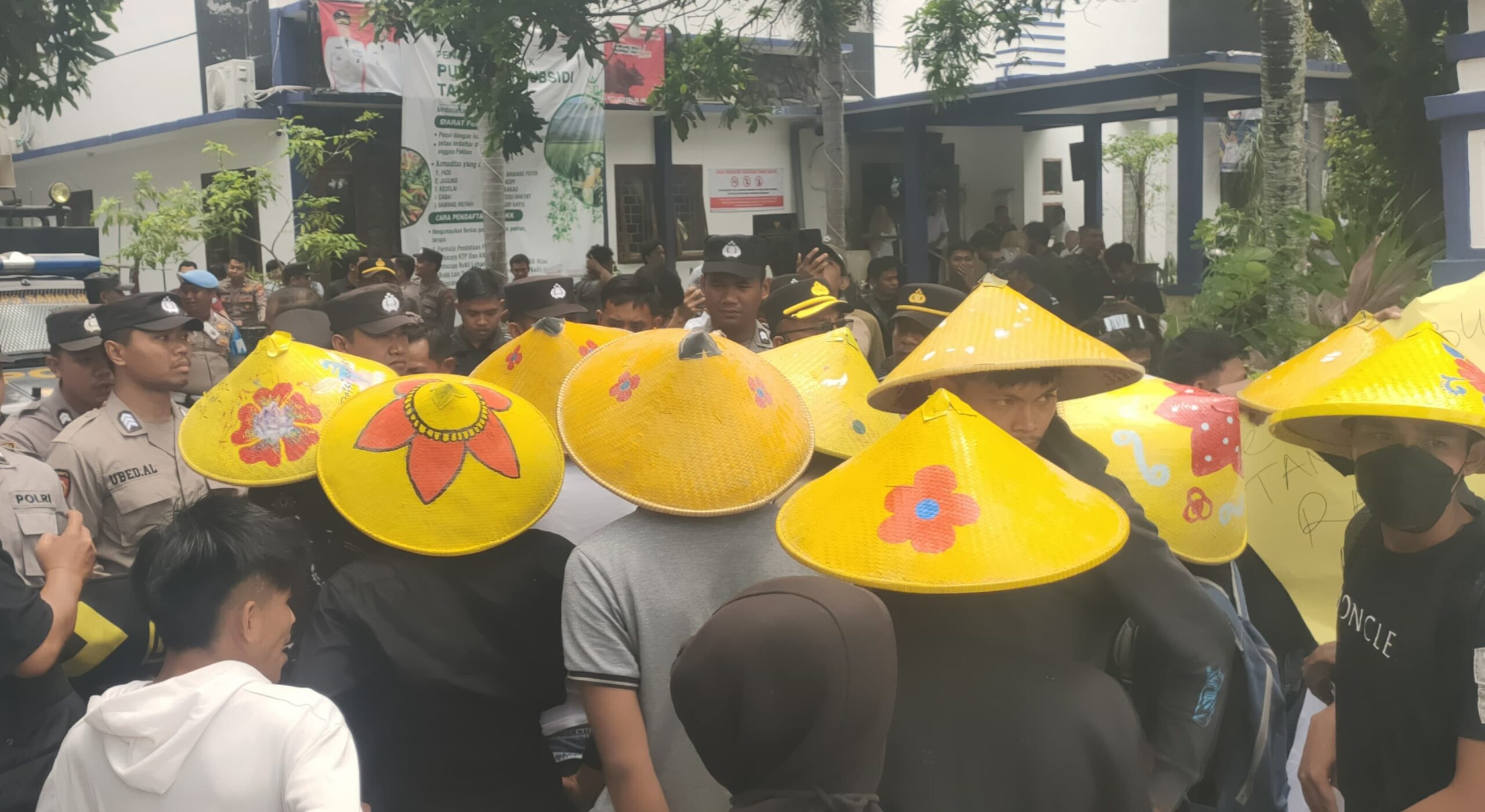 Aliansi Mahasiswa Sampang saat melakukan aksi dengan mengenakan topi sawah. (Foto: Sudutkota.id/Hbb)