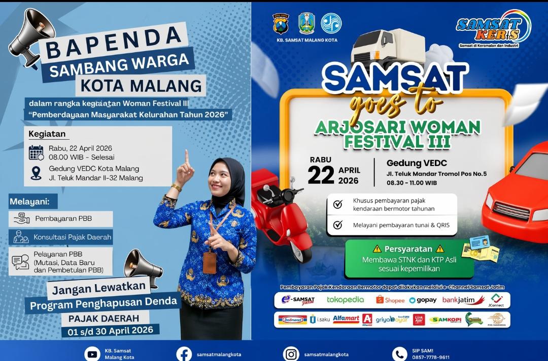 Sudutkota.id – Badan Pendapatan Daerah (Bapenda) Kota Malang terus menggencarkan program “Sambang Warga” dengan menghadirkan layanan langsung di tengah masyarakat. Kali ini, layanan tersebut hadir dalam rangkaian Arjosari Woman Festival III yang digelar pada Rabu, 22 April 2026 di Gedung VEDC Kota Malang, mulai pukul 08.00 WIB hingga selesai.