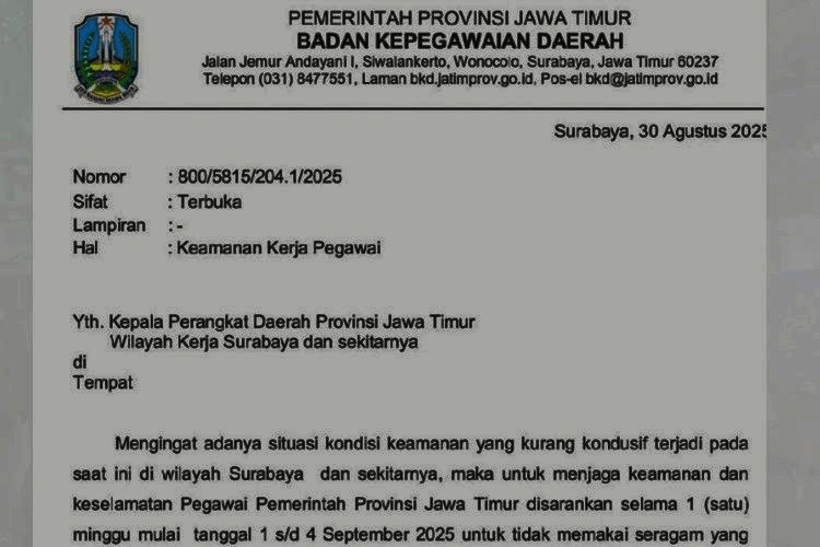 Langkah tersebut diambil menyusul situasi keamanan yang disebut kurang kondusif di wilayah Surabaya. “Untuk menjaga keamanan dan keselamatan pegawai Pemerintah Provinsi Jawa Timur, disarankan sementara waktu memakai baju bebas rapi serta tidak menggunakan kendaraan dinas berplat merah,” demikian bunyi salah satu poin edaran yang ditandatangani secara elektronik oleh Kepala BKD Jatim, Indah Wahyuni.