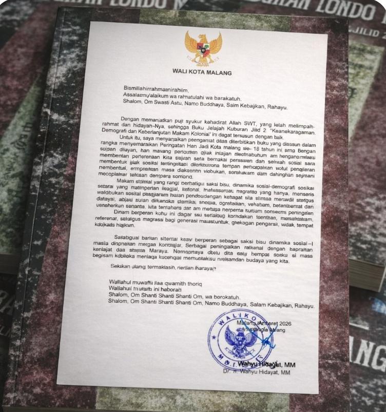 Apresiasi datang dari Wali Kota Malang, Dr. Ir. Wahyu Hidayat, MM, melalui sambutan tertulis tertanggal 30 Maret 2026. Ia menegaskan, buku ini memiliki nilai penting dalam memperkuat literasi sejarah sekaligus menjaga identitas kota.