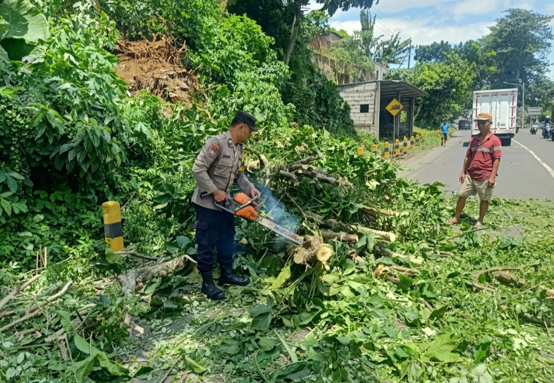 Dalam proses penanganan, petugas kepolisian tidak bekerja sendiri, melainkan berkolaborasi dengan warga sekitar untuk memotong dan menyingkirkan batang pohon dari badan jalan.