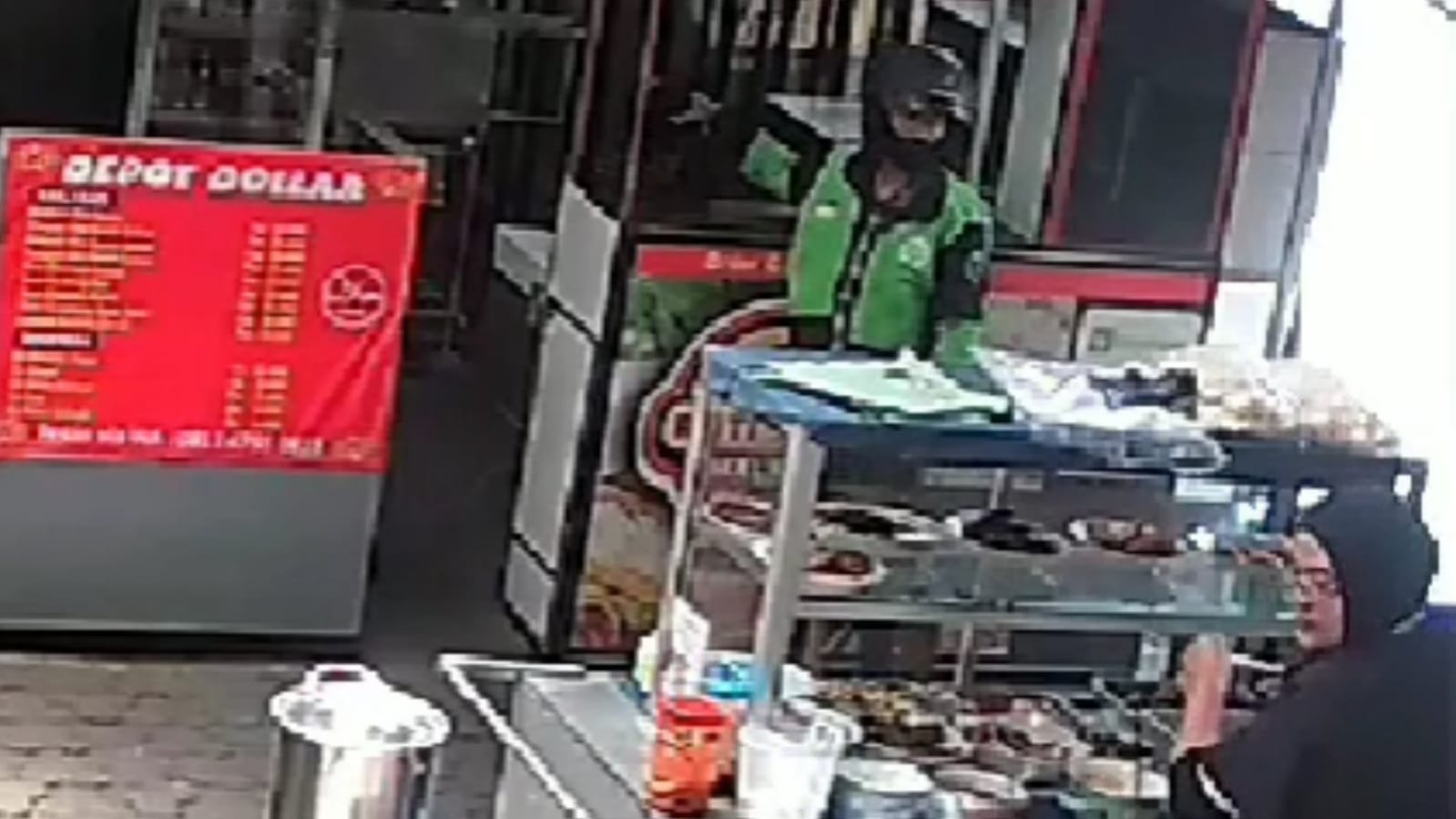 Dalam video rekaman CCTV yang diterima media ini, nampak seorang pria mengenakan baju Ojol, helm warna hitam dan muka ditutup dengan masker seolah memesan sesuatu di sebuah warung. Saat pemilik warung lengah, pria tersebut menggasak tas pemilik warung lalu kabur.