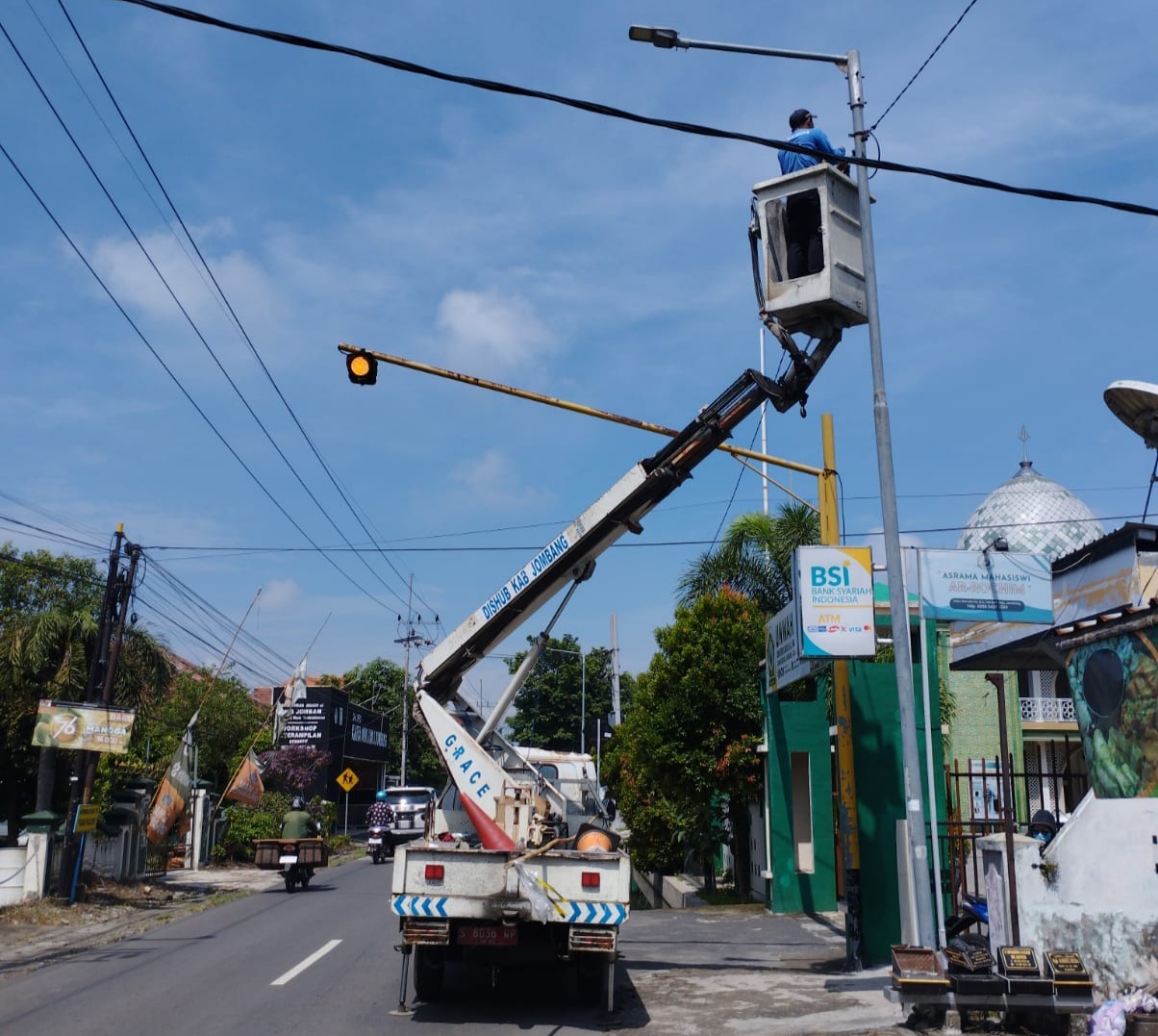 Dishub Jombang saat memperbaiki penerangan jalan umum. (Foto: Sudutkota.id/lok)