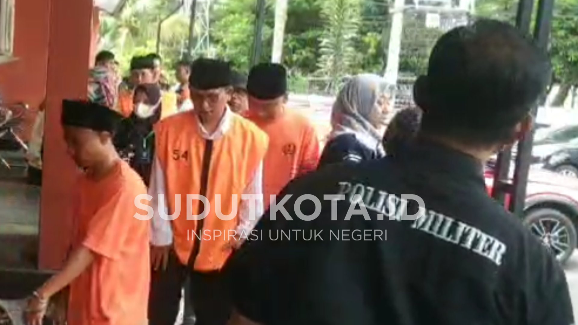 Terdakwa Mustakhim (tengah), mengenakan rompi tahanan dan berkacamata, usai menjalani sidang perkara dugaan pengeroyokan perwira TNI AL di Pengadilan Negeri Malang. (Foto: Sudutkota.id/mit)