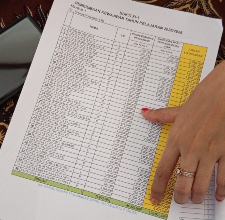 NF menjelaskan, pungutan tersebut dibebankan kepada siswa Tahun Pelajaran 2024/2025 yang saat ini duduk di kelas XI. Ia menyebut, dalam rapat komite yang digelar, wali murid tidak diberi ruang untuk berdialog ataupun bernegosiasi.