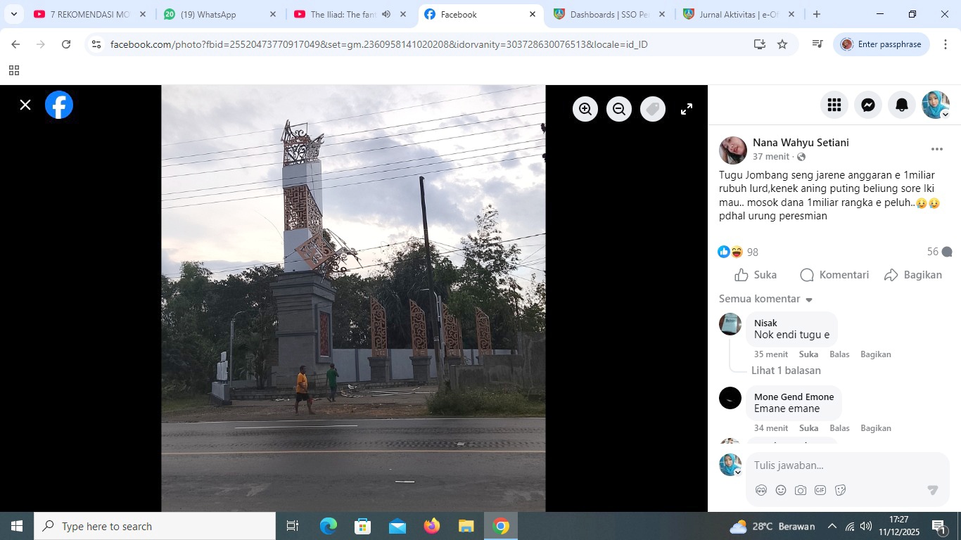 Peristiwa ini langsung memicu sorotan publik. Melalui unggahan di Facebook, warga mempertanyakan kualitas konstruksi tugu tersebut.
